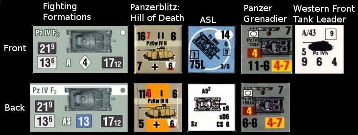 AFV's are more complex beasts than infantry so the AFV counters in FF are more complex than CC's infantry counters, as you'd expect. A comparison of FF's sample PzIV F2 with similiar counters from other games is above. A quick count shows that there are 12 data on the FF counter (front: left to right, top to bottom):